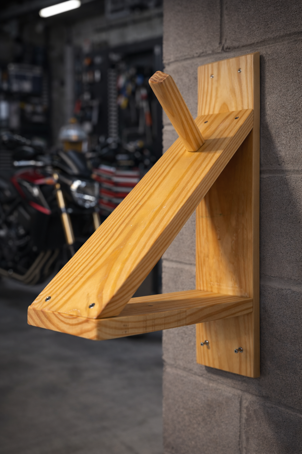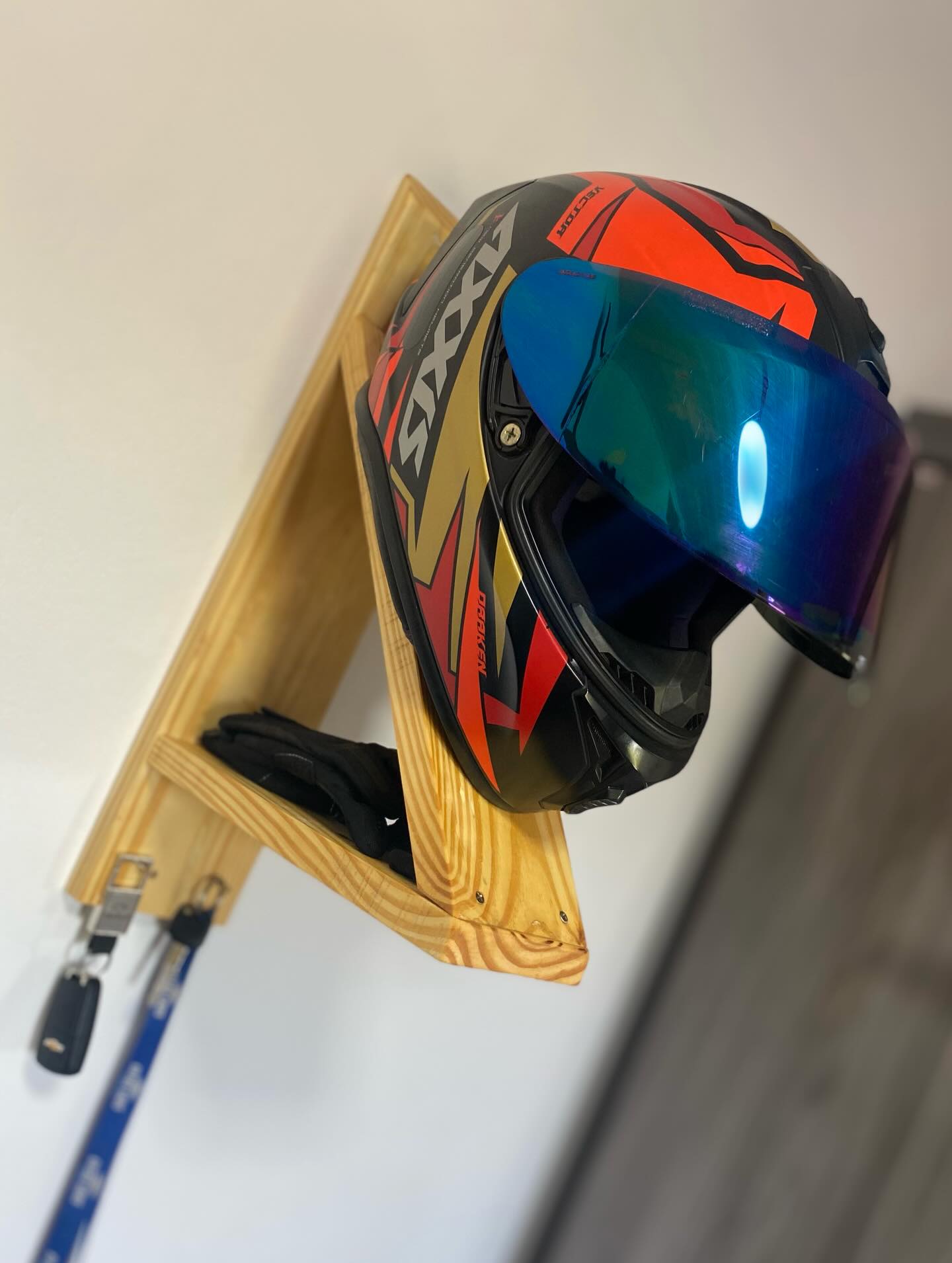 تهلا في خوذتك ومعدات المطور ديالك وحافظ عليهم. ما تخليهمش مرميين فوق الطبالي وتخاف عليهم يتخبشو أو يطيحو. هاد العلاقة المخدومة بالعود الطبيعي غادي تهنيك من الروينة، وغادي تجمع ليك الخوذة، القفازات، والسوارت فبلاصة وحدة، وفنفس الوقت تعطي منظر زوين لحيط دارك.